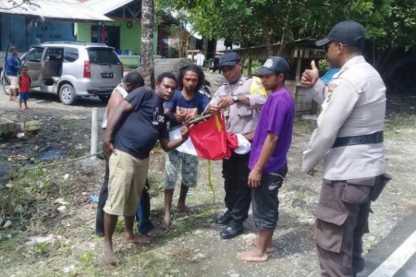 Polisi membantu warga memasang bendera merah putih di setiap halaman permukiman penduduk di Distrik Mimika Timur. Selain itu, petugas juga membagikan ratusan bendera kepada mereka yang belum memilikinya.