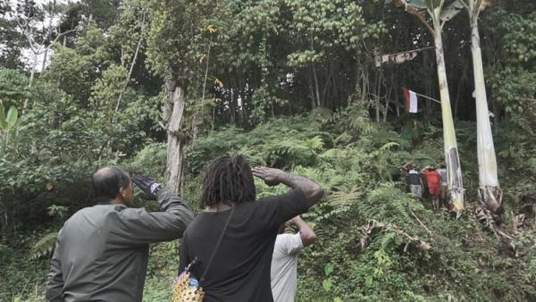 Setelah bendera diberikan, warga tersebut langsung memanjat pohon pisang raksasa di kampung itu yang berada di pinggir hutan. Bendera merah putih pun berkibar di sana.