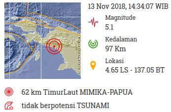“#Gempa Mag:5.1, 13-Nov-18 14:34:07 WIB, Lok:4.65 LS, 137.05 BT (Pusat gempa berada di darat timur laut Mimika), Kedalaman: 97 Km. Dirasakan (MMI) III Timika,” tulis BMKG di akun resmi twitternya.