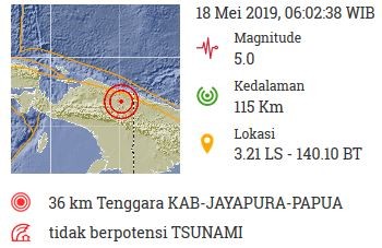 “Gempa Mag:5.0, 18-May-19 06:02:38 WIB, Lok:3.21 LS,140.10 BT (36 km Tenggara KAB-JAYAPURA-PAPUA), Kedalaman:115 Km, tidak berpotensi tsunami,” tulis @infoBMKG, akun twitter resmi BMKG, Sabtu (18/5/2019).