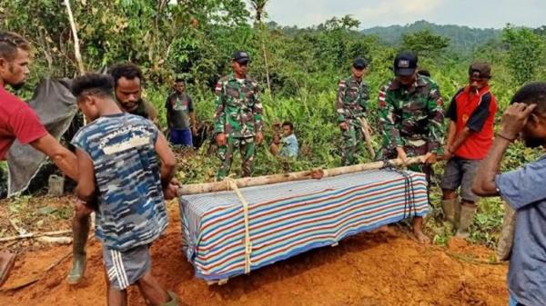 KEEROM, iNews.id - Satuan Tugas (Satgas) Pengamanan Perbatasan (Pamtas) RI-PNG Yonif Raider 509 Kostrad Pos Tatakra membantu prosesi pemakaman warga Kampung Tatakra, Distrik Web, Kabupaten Keerom, Papua, Sabtu (2/11/2019). Hal ini sebagai bentuk kepeduliaan dan rasa empati terhadap kesulitan warga di pedalaman Papua.