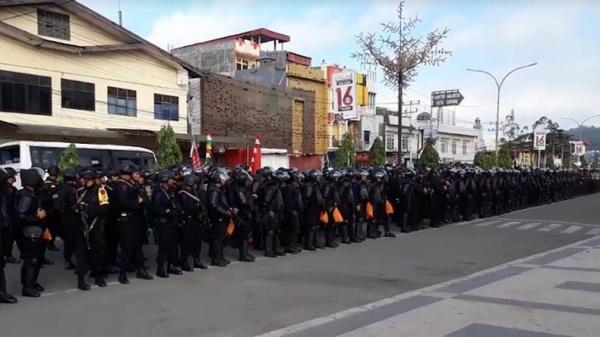 SORONG, iNews.id – Ratusan aparat gabungan TNI dan Polri bersenjata lengkap menggelar apel siaga di halaman Mapolres Sorong Kota, Senin (26/8/2019). Persiapan pengamanan ini mengantisipasi adanya rencana aksi demo damai warga Papua di Kota Sorong, Papua Barat, yang beredar dalam pesan berantai.
