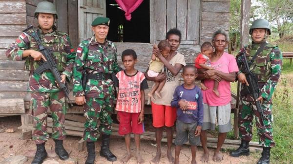 Prajurit TNI AD Prajurit TNI dari Satgas Pamtas RI-PNG Yonif Mekanis Raider 411/Pdw Kostrad Pos Kaliwanggo mengantarkan Herman Mauli Murnan (10) kepada keluarganya di Kampung Erambu, Distrik Sota, Kabupaten Merauke, Papua, Rabu sore (18/9/2019). (Foto: Istimewa)
